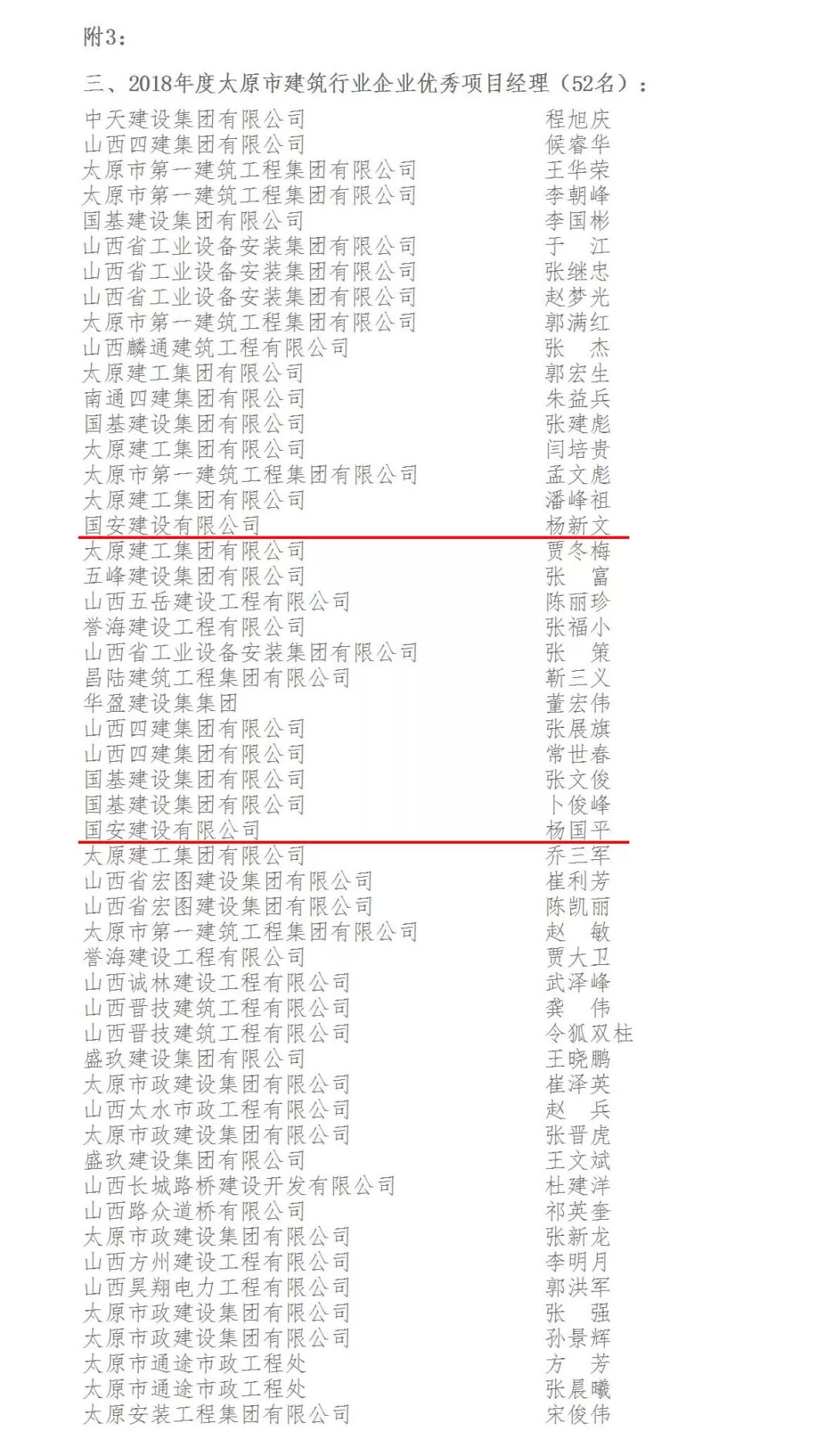 近日,经太原市建筑业协会认定,国安建设有限公司蝉联“太原市建筑行业优秀建筑企业”。同时,公司项目经理杨新文、杨国平被授予“2018年度太原市建筑行业企业优秀项目经理”。