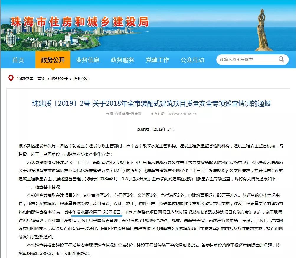 为认真贯彻落实住建部《“十三五”装配式建筑行动方案》《广东省人民政府办公厅关于大力发展装配式建筑的实施意见》《珠海市人民政府关于印发珠海市推进建筑产业现代化发展管理办法(试行)的通知》《珠海市建筑产业现代化“十三五”发展规划》等文件要求,提升珠海市装配式建筑工程质量安全,强化监督管理,珠海市住建局组织开展了全市装配式建筑在建项目质量安全专项巡查。
